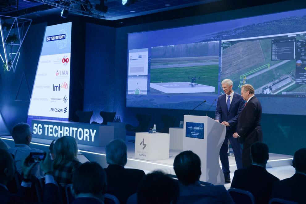 5G Techritory, the Baltic Sea Region 5G ecosystem Forum, was opened with a unique demonstration – for the first time in the region, drone flight BVLOS (beyond the visual line of sight) was conducted on the mobile network, demonstrably switching from one base station to another. The drone was controlled remotely, by Latvian Mobile Telephone (LMT) president Juris Binde and Prime Minister of the Republic of Latvia, Krišjānis Kariņš, while the drone was flying within the Adazi airport territory, 25 km away. LMT tests demonstrated that during the entire duration of the flight, the mobile network strength already meets 97.6% of the requirements for successful remote drone management.