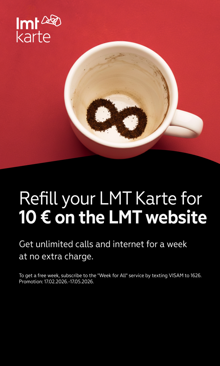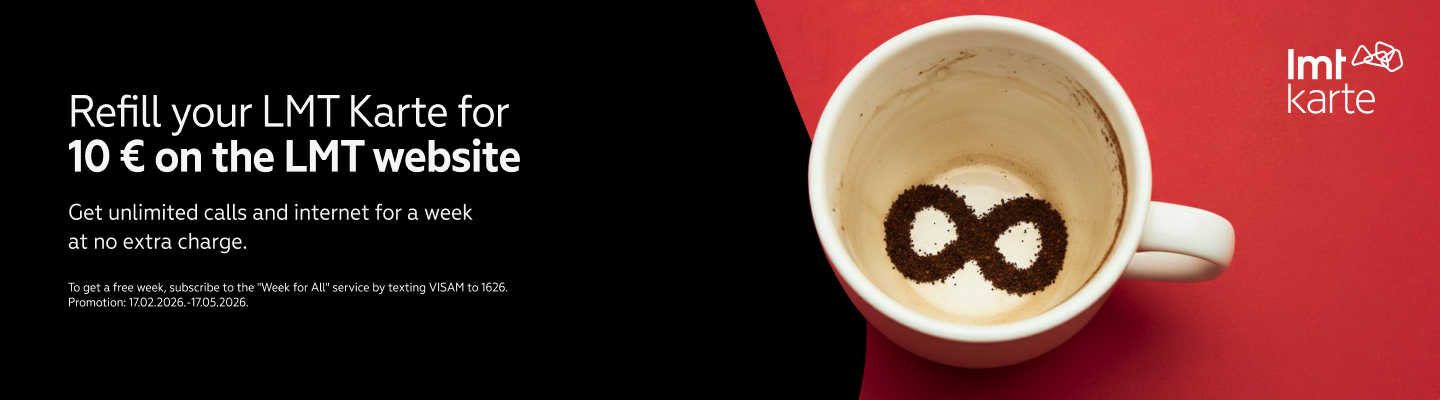 Refill your LMT Karte with at least 10 € here and receive unlimited calls and internet for a week at no extra cost.