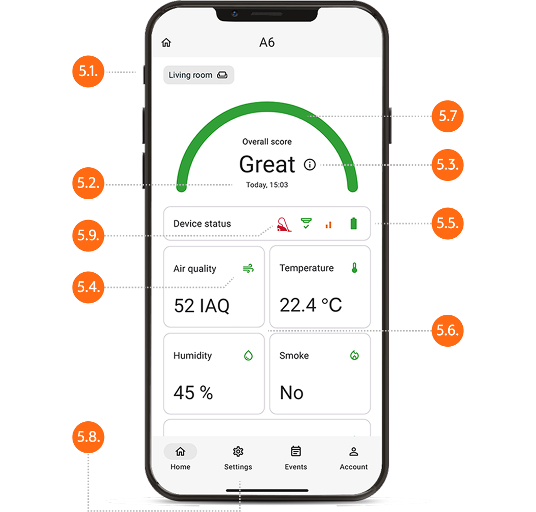 The overall score is a composite rating that considers the following measurements: air quality, temperature, humidity, carbon monoxide and smoke status.
