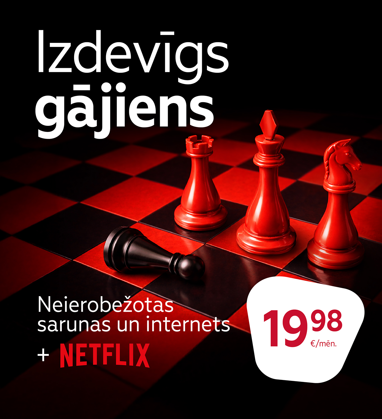 Šis piedāvājums spēkā jaunajiem klientiem, izvēloties komplektu "Brīvība+Neatkarība+Netflix" un slēdzot līgumu uz 12 mēnešiem. Pēc tam mēneša maksa no 23.98 €/mēn.