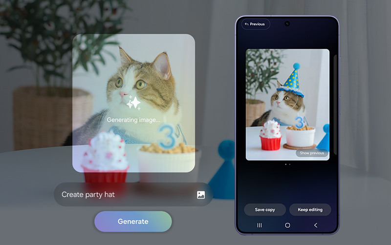 Galaxy tālruņos un planšetēs esošais Photo Assist ļauj viegli rediģēt fotoattēlus. Pārvieto, maini izmērus vai dzēs objektus manuāli, un ļauj AI aizpildīt tukšās vietas, lai iegūtu vienmērīgus fotoattēlus. Vari arī ievietot uzvedni vai atsauces attēlu, lai pievienotu jaunus elementus, piemēram, uzlikt kādam objektam cepuri. Izbaudi iztēles brīvību un radošumu!