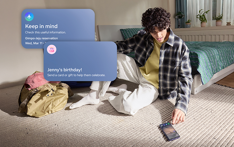* Lai izmantotu funkciju Now Brief, ir jāpiesakās Samsung kontā. Pakalpojuma pieejamība var atšķirties atkarībā no valsts, valodas, iekārtas modeļa un lietotnēm. Lai izmantotu dažas funkcijas, var būt nepieciešams tīkla savienojums. Moments ģenerētie fotoattēlu apraksti var neatbilst lietotāja iecerei. Notikumu grafika paziņojumi tiek atbalstīti kalendāra lietotnēs, kas izmanto Android kalendāra datubāzi, un ir pieejami, ja ir instalēts Samsung Calendar. Lai saņemtu paziņojumus par suņu pastaigām, lietotnē SmartThings ir jāaktivizē SmartTag2 un Pet Care. SmartTag2 iegādājams atsevišķi. Lai paziņojumus izmantotu kā atgādinājuma datus, tiem jābūt ieslēgtiem. Atmiņas dati, kas pieejami no atbalstīto lietotņu paziņojumiem, ziņojumiem, Gmail un Samsung Wallet, kā arī no Gmail apkopotie dati ir iespējami tikai tad, ja lietotājs piekrīt Personal Data Intelligent Gmail lasīšanas atļaujai. Rezervācijas informācijas atgādinājuma dati ir pieejami tikai no rezervācijas apstiprinājuma ziņojumiem.