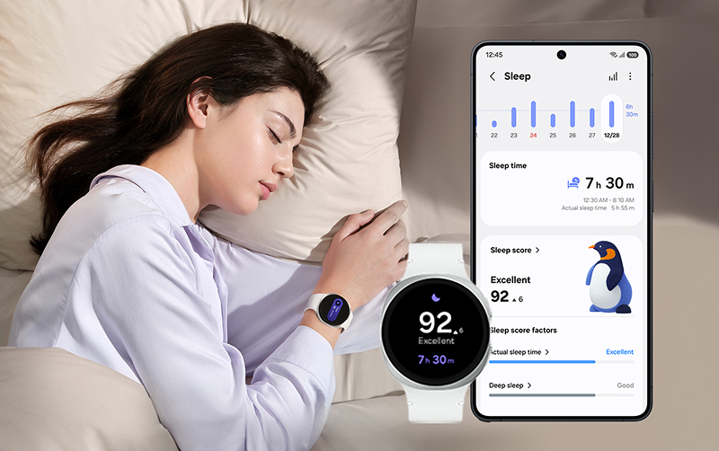 Izmantojot Bedtime Guidance, tu modīsies kā atpūties cilvēks. Vienkārši, dodoties gulēt, nenovelc savu Galaxy Watch, un tas noteiks tavu ideālo gulētiešanas laiku, vadoties no taviem personīgajiem miega datiem. Turklāt tu vari to viegli pielāgot savām vajadzībām, izmantojot tālruni vai planšeti, piemēram, iestatīt vēlamo pamošanās laiku vai ieslēgt gulētiešanas paziņojumus.